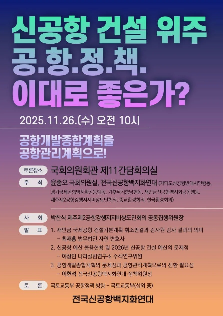 신공항 건설 위주 공.항.정.책. 이대로 좋은가? Wednesday 26 November 2025 10:00 12:30 국회의원회관 제11간담회의실 (map) Google Calendar ICS