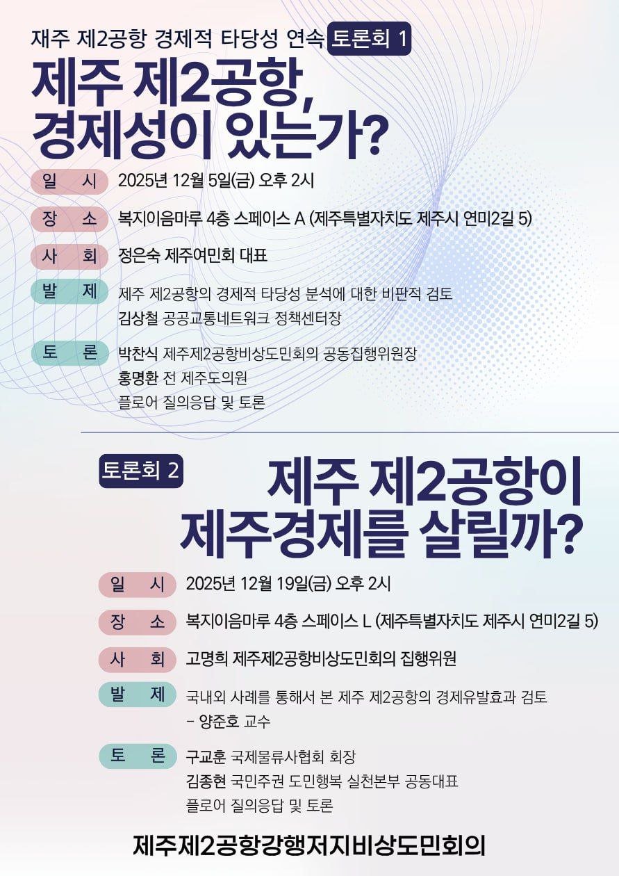 제주 제2공항 경제적 타당성 연속 토론회 2 Friday 19 December 2025 14:00 18:00 복지이음마루 4층 스페이스 L 제주특별자치도 제주시 연미2길 5 (map) Google Calendar ICS