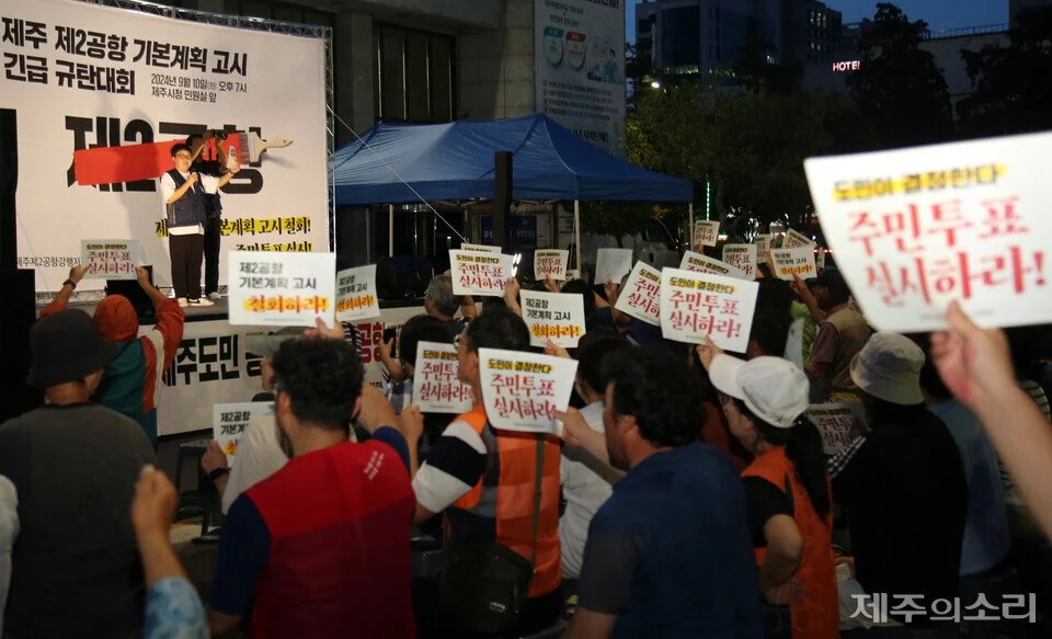 제2공항강행저지비상도민회의(이하 도민회의)는 10일 오후 7시 제주시청 민원실 앞에서 제주 제2공항 기본계획 고시 긴급 규탄대회를 열어 “도민 동의 없는 제2공항 기본계획 고시를 철회하고 주민투표를 실시하라”고 촉구했다.