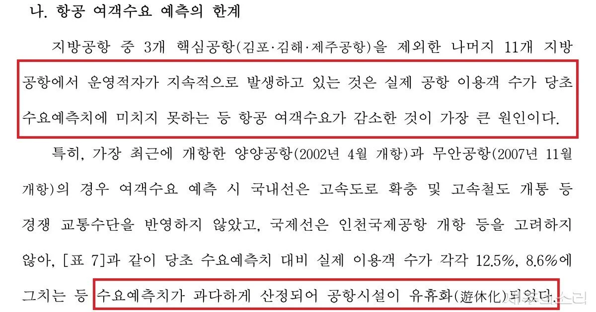 가장 최근에 개항한 무안공항(2007년 11월 개항), 양양공항(2002년 4월 개항)의 경우 당초 수요예측 대비 실제 이용객이 각각 8.6%, 12.5%에 그친다.
